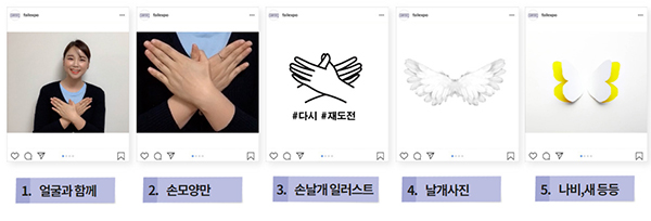 ‘다시 챌린지’는 위기를 극복하고 다시 시작하려는 가족, 친구 등 주변 사람에게 응원의 날개를 보낸다는 의미로, 날개 모양의 손동작을 활용하거나 응원의 날개를 표현한 손 그림, 사진 등 다양한 방식의 표현이 가능하다.