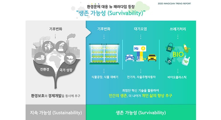 이노션의 이수진 데이터커맨드팀장은 “환경보호와 경제 성장을 함께 달성하고자 하는 지속가능성의 패러다임으로는 인간의 생존을 위협하는 환경문제에 대응 할 수 없는 상황”이라며, “환경문제에 대한 새로운 대응방식으로 지난 수 세기 동안 인간생활에 혁명을 가져온 농업·자동차·바이오 화학 산업 등을 현재의 최첨단 혁신 기술을 활용해 인간 삶의 질적 향상을 이룰 수 있는 생존가능성(Survivability)으로 패러다임의 전환이 필요하다”고 말했다.
