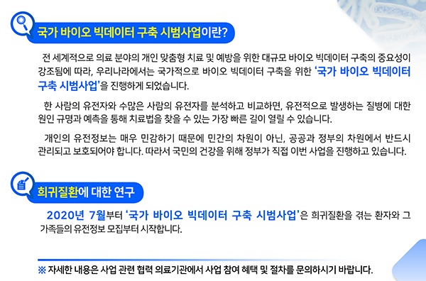 한편 희귀질환 환자 참여 신청 및 문의는 16개 희귀질환 협력기관 및 국가 바이오 빅데이터 구축 사무국을 통해 상담받을 수 있다.