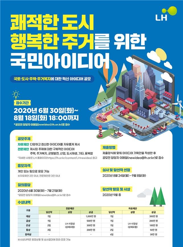 LH는 주택, 주거복지, 균형발전, 산업 등 LH의 여러 사업에 대한 아이디어 발굴을 위해 ‘쾌적한 도시ㆍ행복한 주거를 위한 국민 아이디어 공모전’을 개최한다고 1일(수) 밝혔다.
