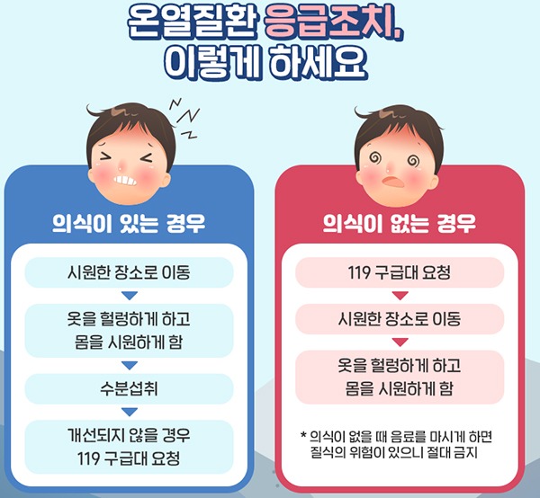 온열질환은 두통, 어지러움, 근육경련, 피로감, 의식저하 등의 증상을 보이는데 방치 시에는 생명이 위태로울 수 있는 질병으로 열탈진(일사병)과 열사병이 대표적이다.