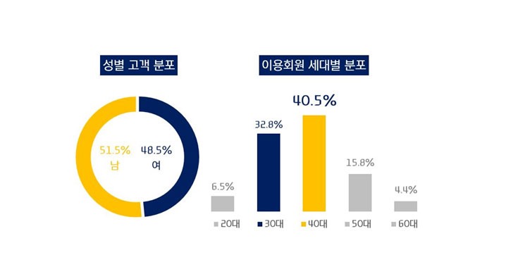 회원별 결제금액과 이용 패턴도 흥미롭다. 올해 1분기 기준, 1인당 결제금액은 40대 남성과 30대 남성이 1, 2위를 기록했으며, 1인당 월 평균 이용 건수는 60대 여성과 40대 여성이 가장 높게 나타났다.