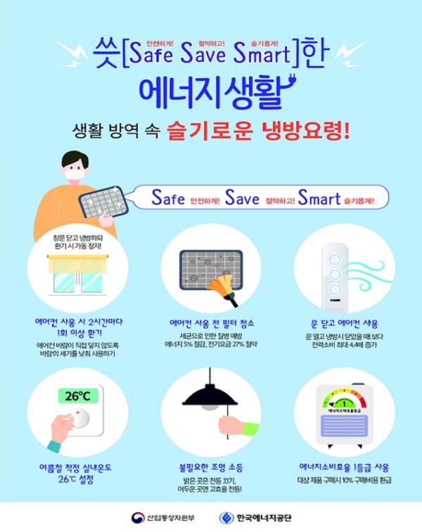 슬기로운 냉방요령은 에어컨 사용 시 2시간마다 1회 이상 환기, 에어컨 사용 전 필터 청소, 문 닫고 에어컨 사용하기, 여름철 적정 실내온도 26℃, 불필요한 조명 끄기, 에너지효율 1등급 제품 사용 등이다.