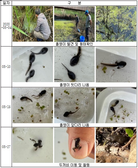 지난 5월 발견한 수십만 개의 알이 부화하여 올챙이 시절을 끝내고 성체로 뭍에 상륙하는데 성공한 것이다.