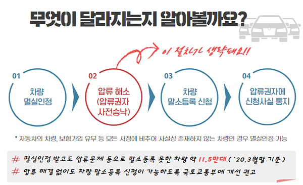 앞으로 장기 미보유(이하 ‘멸실인정’) 차량에 대한 말소등록 절차가 간소화되어 사전에 차량 압류문제를 해결하지 않더라도 말소등록 신청이 가능해진다.