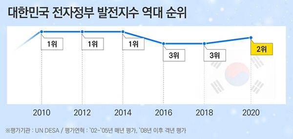 우리나라가 2020년도 UN 전자정부평가에서 193개 회원국 중 전자정부발전지수 2위(1위 덴마크), 온라인참여지수 공동 1위(한국, 미국, 에스토니아)를 기록했다.