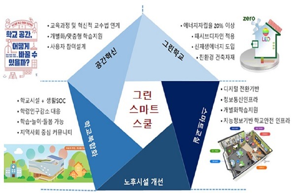 특히 학교는 학생·교직원 참여 설계를 통한 공간혁신을 바탕으로 친환경 그린 스쿨, 디지털 기반 스마트 스쿨, 지역사회와 함께하는 학교시설 복합화 등을 종합적으로 반영한 그린 스마트 미래 학교를 구축한다.