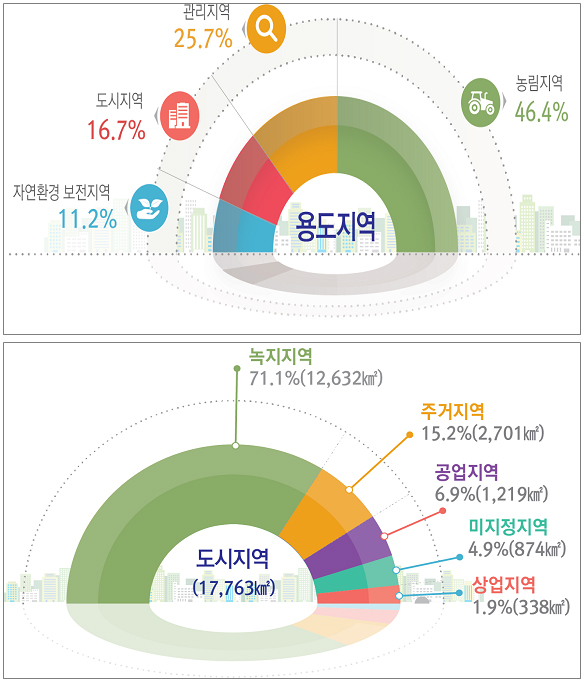 도시지역은 다시 주거지역 2701㎢(15.2%), 상업지역 338㎢(1.9%), 공업지역 1219㎢(6.9%), 녹지지역 1만 1632㎢(71.1%), 미지정지역 874㎢(4.9%)로 나뉜다.