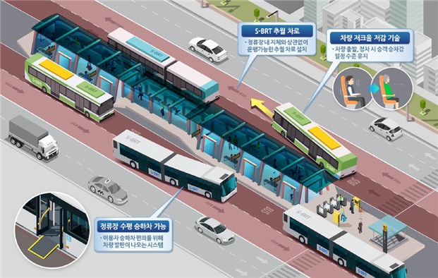 특히, 교차로 구간 미정차로 S-BRT의 평균 운행속도를 도시철도 수준으로 향상시키고, 기상 상황 등 외부 환경으로부터 승객을 보호하는 스마트 정류장과 승하차 동시 처리가 가능한 굴절버스 등을 실제 시험 운영할 계획이다.