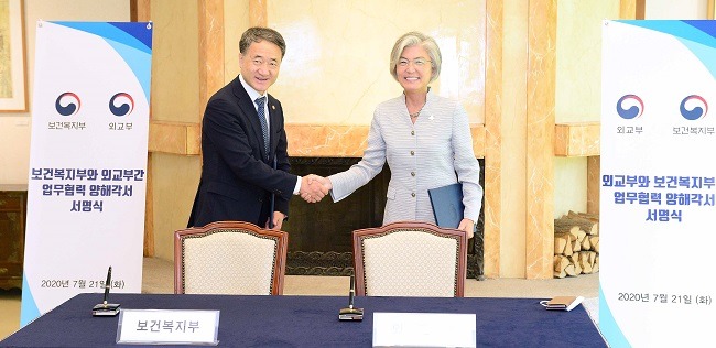 외교부와 보건복지부는 7.21.(화) 보건안보 관련 양 부처 간 업무협력 체계 강화를 위해 기존 업무협력 양해각서(2013.9월 체결)를 개정하여 ‘보건안보 및 보건의료복지 분야 국제협력 확대를 위한 외교부-보건복지부간 업무협력 양해각서’를 체결하였다.