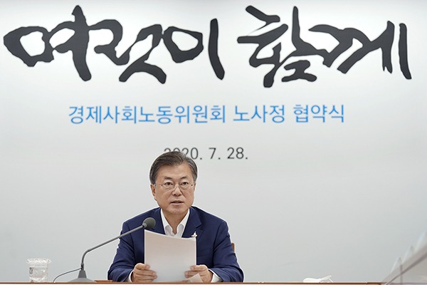 문재인 대통령은 28일 경제사회노동위원회(경사노위)가 의결한 ‘코로나19 위기 극복을 위한 노사정 협약’에 대해 “서로 조금씩 고통을 분담해 이룬 합의가 기업과 일자리를 지키면서 빠른 경제 회복은 물론 경제적 불평등 해소에도 큰 도움이 되리라 확신한다”고 말했다.