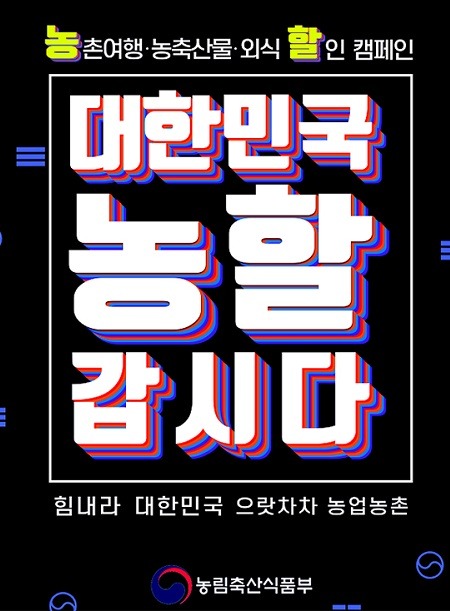 농림축산식품부는 코로나19로 인해 침체된 농촌경제에 활력을 불어넣기 위해 농촌여행, 국산 농축산물 구매, 외식소비 등 3가지 분야의 할인 캠페인 ‘대한민국, 농할갑시다!’를 추진한다고 28일 밝혔다.
