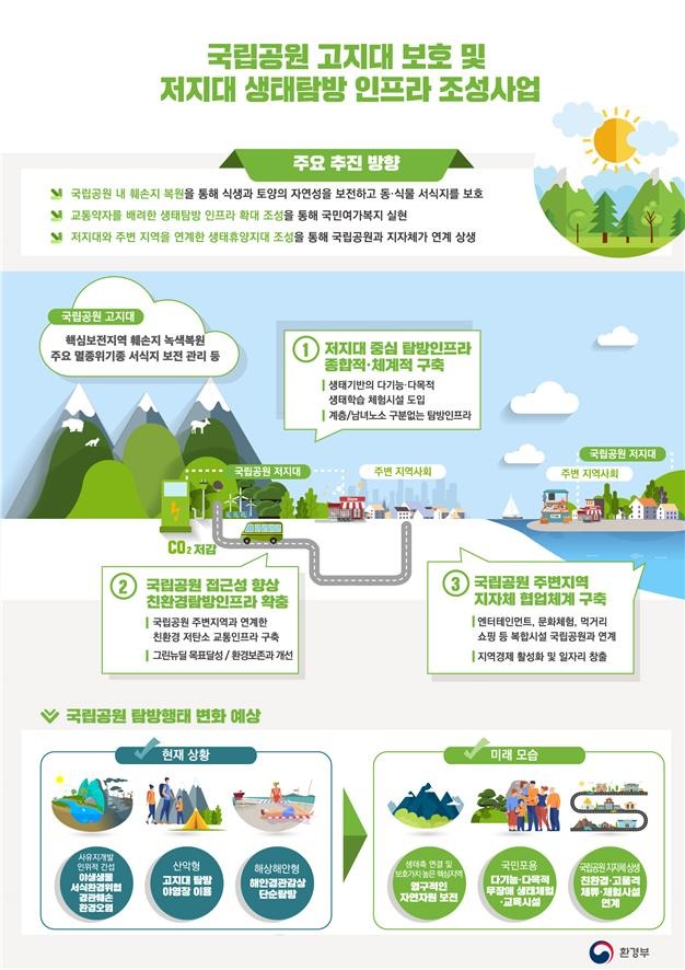 한편, 우리나라 자연환경을 대표하는 국립공원에 대해서는 보전 및 지속가능한 이용을 위하여 훼손지 16개소를 '25년까지 복원하고, 저지대를 중심으로 친환경·고품격 생태탐방 기반시설을 확충해나갈 계획이다.