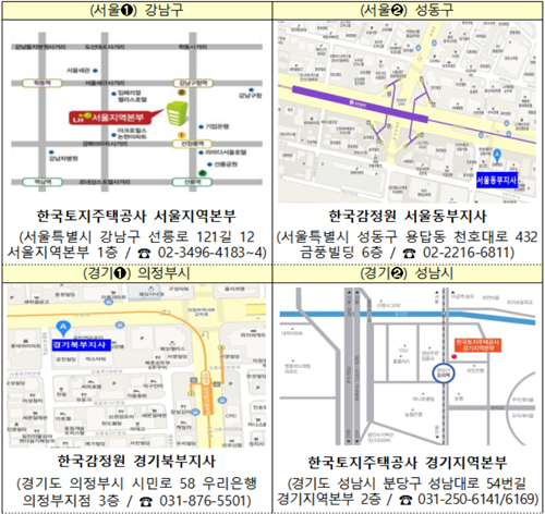 LH는 강남구 서울지역본부와 성남 경기지역본부에, 한국감정원은 성동구 서울동부지사와 경기 의정부시 경기북부지사에 방문상담소를 24일 연다.