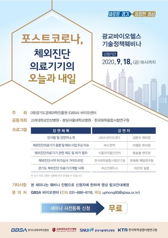 경기도는 경기도경제과학진흥원 바이오센터와 함께 코로나19와 같은 감염병 진단에 중요시 되고 있는 체외진단의료기기에 대한 비대면 세미나를 개최한다. 이번 세미나는 2020년 경기도 의료기기산업 육성지원 사업 내 ‘경기 첨단의료기기 협의체(G-MediCluster) 운영 및 확대’의 일환이다.