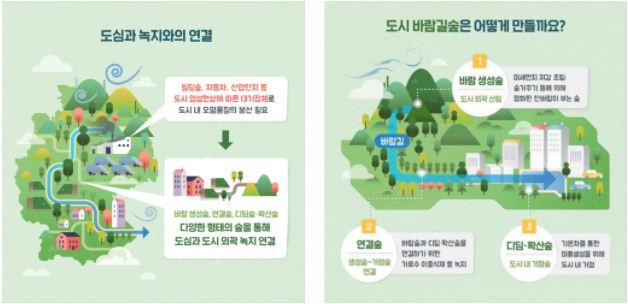 ‘바람생성숲’은 산림의 공기가 도심 방향으로 내려갈 수 있도록 ‘숲 가꾸기’를 통해 바람의 통로를 만들고, 미세먼지 저감수종을 보충하는 방식으로 조성한다. ‘디딤‧확산숲’은 도심 내 공원이나 건물 외벽 등을 활용해 소규모 숲을 조성해 기온 차로 인한 미풍을 생성하는 방식이다.