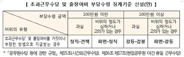 이번 개정안의 주요 내용을 보면 먼저 초과근무수당 및 출장여비 부당수령에 대해 비위 특성을 고려한 맞춤형 징계기준이 신설된다.
