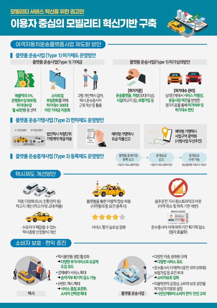 먼저, 새롭게 신설된 플랫폼 운송사업(Type1) 허가제도를 통해 플랫폼 사업자들이 안정적인 제도적 기반 아래 이용자 수요와 요구에 맞춘 다양한 서비스 모델을 출시할 수 있도록 했다.