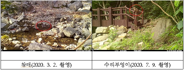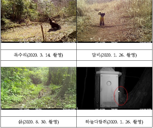 무인관찰카메라에 포착된 멸종위기 야생생물은 Ⅰ급 수달과 Ⅱ급 독수리, 하늘다람쥐, 삵, 담비, 수리부엉이, 참매이다.