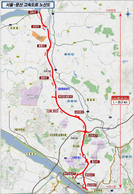 서울~문산 고속도로는 경기 고양시 덕양구 강매동에서 파주시 문산읍 내포리를 연결하는 총 연장 35.2km, 왕복 4~6차로 도로다.
