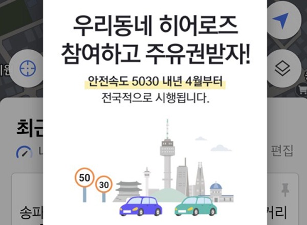 또한 ‘안전속도 5030’ 정책 시행을 국민들에게 널리 알리기 위해 정책 시행 개요를 T맵 음성으로 안내하고, 캠페인 페이지 내 이미지 형태로 정책에 대한 설명과 홍보도 함께 진행할 계획이다.