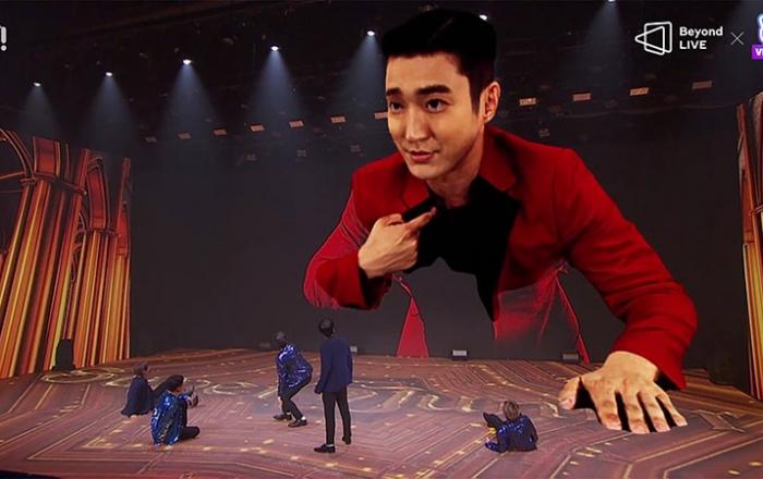 슈퍼주니어 온라인 콘서트 '비욘드 라이브(Beyond LIVE)’에서 3D 혼합현실 공연인기 그룹 슈퍼주니어가 온라인 콘서트 무대에 올랐다. 슈퍼주니어 멤버 가운데 최시원씨가 보이지 않자 나머지 멤버들이 다급히 찾았다. 이때 무대 뒷편에서 램프의 요정 지니처럼 거대한