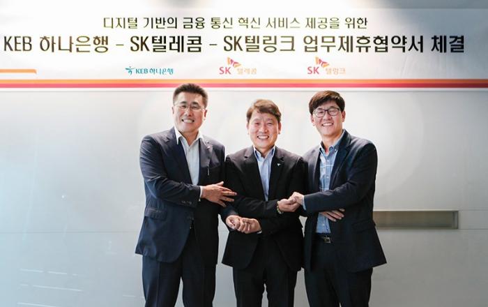 SK텔레콤이 KEB하나은행∙SK텔링크와 손잡고 금융∙통신 분야의 혁신을 공동 추진한다.3사는 서울 을지로 SK텔레콤 본사에서 ‘디지털 기반의 금융∙통신 혁신 서비스 제공을 위한 양해각서(MOU)’를 체결했다고 1일 밝혔다. 체결식엔 SK텔레콤 김성수 MNO사업부 영업본