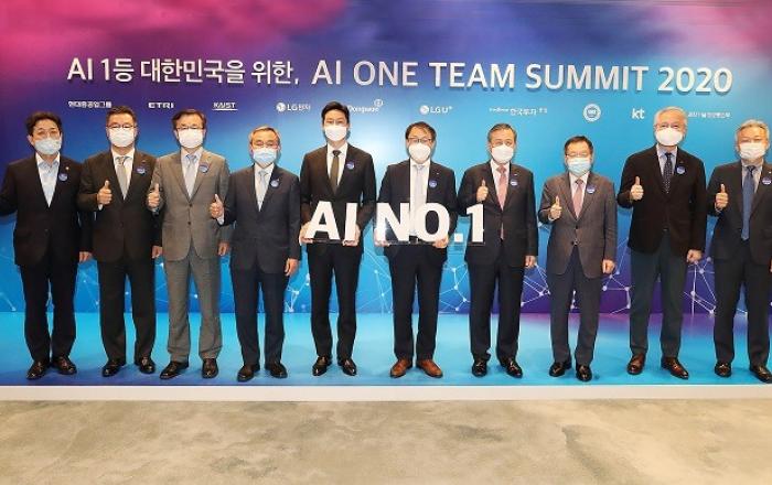 대한민국 인공지능(AI) 1등을 위해 의기투합한 ‘AI 원팀’ 참여기관 대표자들이 모여 AI를 활용한 코로나19 위기 극복과 AI 혁신 가속화 방안에 대해 논의했다. KT가 25일 오후 현대중공업그룹, LG전자, LG유플러스, 한국투자증권, 동원그룹, 한국과학기술원(