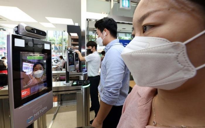 # 병원 출입 게이트에 내방객이 다가서자 '디지털 사이니지'에서 얼굴인식 엔진과 열 감지 리더기가 자동으로 구동된다. AI는 내방객이 이미 등록된 고객이며, 고열도 없고 마스크도 착용했음을 0.2초만에 확인한다. 내방객은 별도로 체온 측정이나 출입카드 태그가 필요 없어