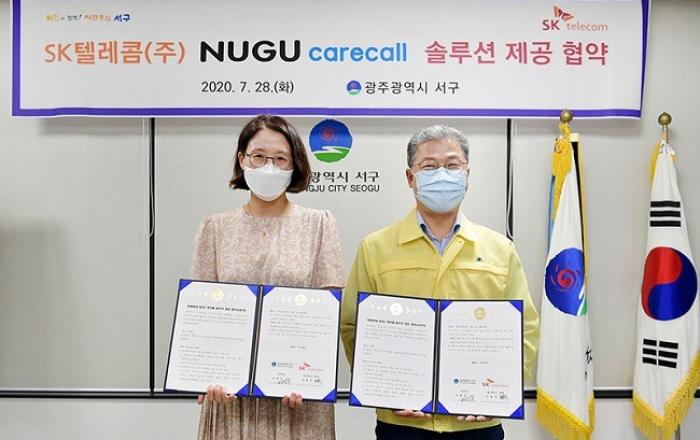 SK텔레콤이 경상남도청에 이어 광주광역시 서구청과 ‘누구 케어콜’ 도입 협약을 맺으며 코로나19 방역현장 지원에 박차를 가하고 있다.SK텔레콤은 코로나19 바이러스 관련 능동감시∙음성판정자의 증상을 모니터링하는 AI 시스템 ‘누구 케어콜’을 광주광역시 서구에 지원한다고