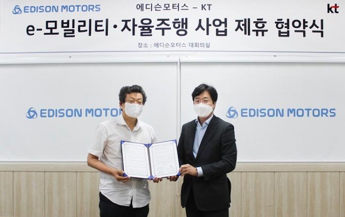 KT가 국내 전기차 제조사 에디슨모터스와 친환경 자율주행 전기차 개발을 공동으로 추진하기 위한 업무협약(MOU)을 체결했다고 23일 밝혔다. 에디슨모터스는 전기버스와 전기트럭 등 특수목적 차량을 개발 및 제조하는 기업이다. 친환경 자율주행 전기차 개발을 위해 KT는