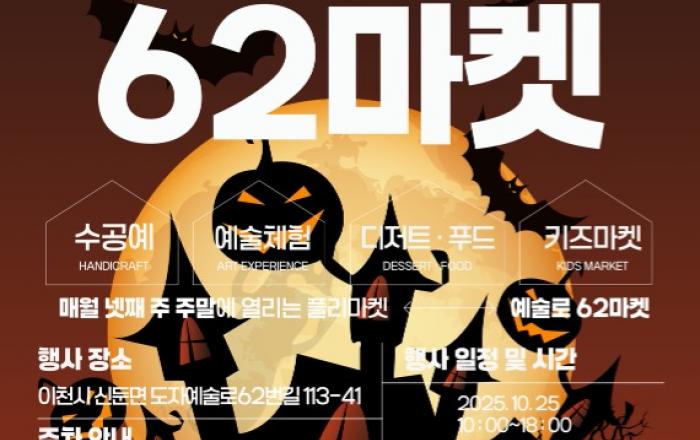 이천도자예술마을(예스파크)에서 오는 10월 25일(토)부터 26일(일)까지 지역 예술가와 시민이 함께 어우러지는 수공예 장터 ‘예술로62마켓’이 열린다. 이번 행사는 할로윈 시즌을 맞아 “예술과 함께 즐기는 특별한 주말”을 주제로, 방문객들에게 다채로운 예술 체험과 즐