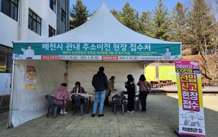 제천시가 오는 24일까지 세명대 및 대원대 일원에서 '출장전입신고 접수처'를 운영한다. 통상 전입신고는 주소지 행정복지센터로 신분증을 지참해 직접 해야 하기 때문에 전입하고자 하는 학생들의 불편함이 크다. 이러한 불편함을 해소하고, 신고를 보다 효율적으로 접수하