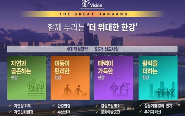 사업비전 및 핵심전략 오세훈 서울시장은 9일, 서울의 도시경쟁력 5위 달성을 견인할 '그레이트 한강 프로젝트 추진계획'을 발표하고, 국제도시로의 새로운 도약을 하겠다고 밝혔다 한강은 최대 강폭이 1.2km로 센강, 템즈강의 5~6배에 달하고, 길이 41.