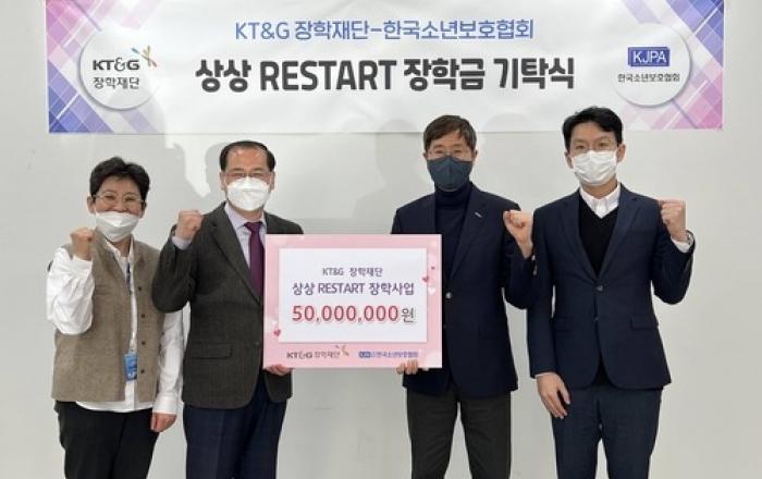KT&G장학재단이 보호 청소년의 건강한 성장과 사회 정착을 지원하기 위해 지난 14일 '23년 상상 RESTART 장학금' 기탁식을 개최하고 한국소년보호협회에 장학금을 전달했다. '상상 RESTART 장학사업'은 생활 태도가 모범적인 무의탁 소년원 재·출원생 중 학