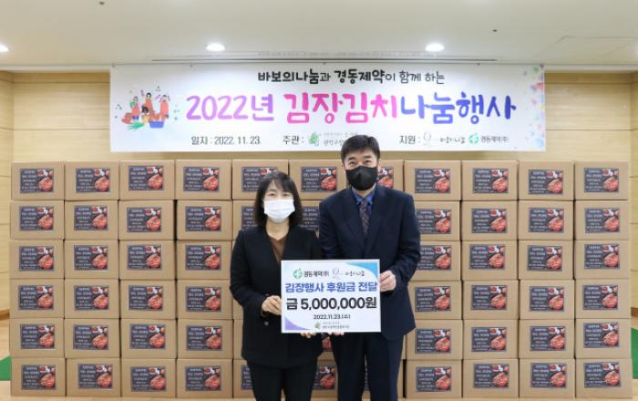 경동제약이 연말을 맞아 김장김치 나눔에 나섰다.경동제악은 11월 23일 관악구장애인종합복지관에서 ‘2022년 김장김치 나눔 행사’ 후원금 전달식을 진행했다고 밝혔다.이번 나눔은 경동제약이 재단법인 바보의나눔에 후원금을 지정 기탁해 진행한 것으로, 본사가 있는 관악구의