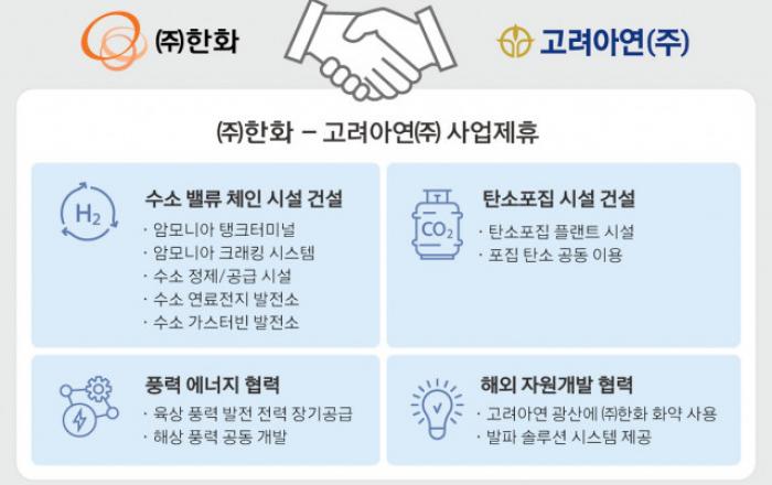 한화는 수소·풍력 등 친환경 에너지 및 해외 자원 개발 사업을 확대하고 신사업 역량을 증대시키기 위해 고려아연과 주식 맞교환을 통한 사업제휴를 맺는다고 23일 밝혔다.한화는 이번 제휴로 최근 합병한 건설 부문의 신성장 동력인 수소와 풍력 발전 등 그린 에너지 사업 분야