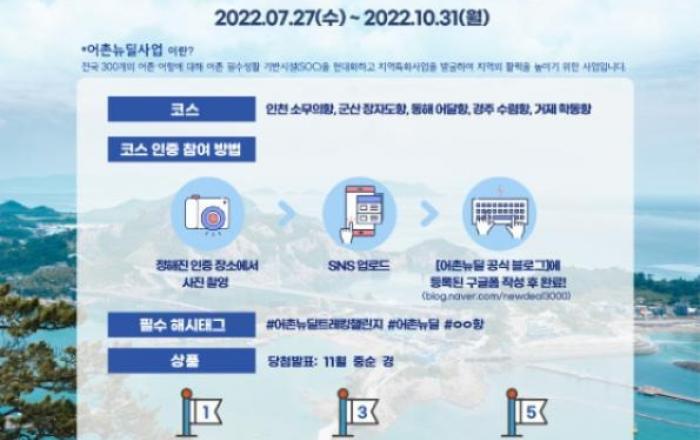 7월 27일(수)부터 10월 31일(월)까지 강원도 동해시 어달항, 경상북도 경주시 수렴항, 경상남도 거제시 학동항, 전라북도 군산시 장자도항, 인천시 소무의항 등 어촌뉴딜 300사업 완공지 및 준공 예정지 5개소에서 ‘2022년 어촌뉴딜 트레킹 챌린지’를 진행한다.이