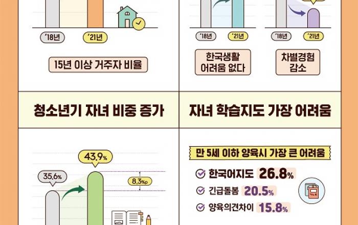 여성가족부는 전국 다문화가족 1만 5578가구를 대상으로 실시한 ‘2021년 전국 다문화가족 실태조사’ 결과를 27일 발표했다. 이번 조사는 ‘다문화가족지원법’ 제4조에 따라 다문화가족에 대한 기초자료를 수집해 중장기 지원정책 수립에 활용하기 위해 2009년부터