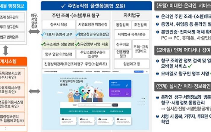 주민이 직접 지방자치단체를 방문하지 않고도 PC와 스마트폰 등 온라인으로 주민조례, 주민투표, 주민소환을 청구하는 시대가 열렸다.행정안전부와 17개 시·도는 이와 같은 내용을 처리할 수 있는 주민참여 온라인플랫폼 ‘주민e직접’을 공동으로 구축해 8일부터 서비스를 개시한