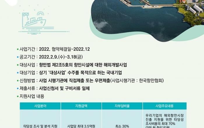 해양수산부는 9일부터 3월 18일까지 해외 항만개발 타당성 조사 비용의 최대 70%를 지원하는 ‘해외 항만개발시장 진출 지원사업’ 대상자를 모집한다고 8일 밝혔다.‘해외 항만개발시장 진출 지원사업’은 해외 유망사업 발굴을 지원하고 국내 기업의 글로벌 항만시장 경쟁력 강