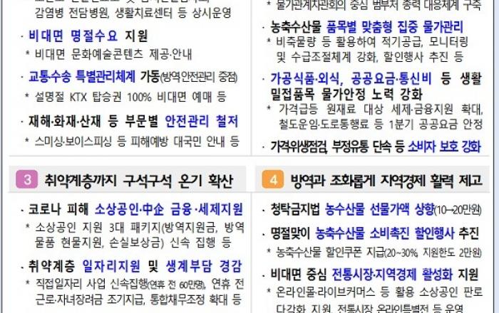 정부가 설 연휴 전까지 노인·장애인 등 직접일자리 60만명 이상을 채용하고, 철도운임과 고속도로 통행료 등 공공요금 인상을 억제하기로 했다. 또한 소상공인과 중소기업에 40조원 규모의 정책자금을 조달하고 소상공인 지원 3대 패키지를 신속 집행하는 등 코로나 위기극복 지