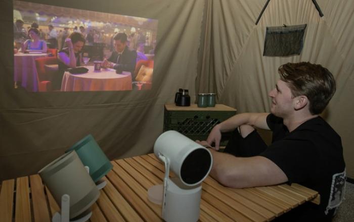 삼성전자가 미국 라스베이거스에서 열리는 세계 최대 전자 전시회 ‘CES 2022’ 개막을 하루 앞둔 4일(현지 시각) 공간에 구애받지 않고 ‘나만의 스크린’을 만들 수 있는 포터블 스크린 ‘더 프리스타일(The Freestyle)’을 공개했다. 더 프리스타일은 한 손에