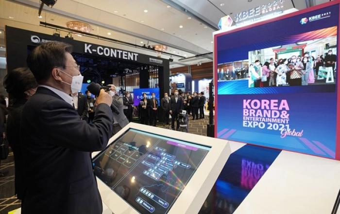 문재인 대통령은 11일 서울 코엑스 그랜드볼룸에서 열린 ‘2021 K-박람회’ 현장을 찾아 콘텐츠, 농수산식품, 화장품, 브랜드K 소비재 등의 전시홍보관과 화상 상담회를 참관하고 기업인 및 행사 관계자를 격려했다.이날 방문한 ‘2021 K-박람회’는 그간 부처별로 진행