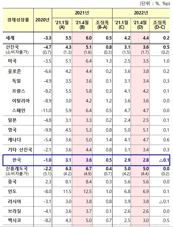 이에 따르면 한국의 올해 경제성장률은 3.6%로 지난 1월 대비 0.5%포인트 상향 조정했다. 지난달 26일 발표한 한국 연례협의 보고서 내용과 동일한 수치다. 2022년 한국 경제성장률은 2.8%로 0.1%포인트 하향 조정했다.