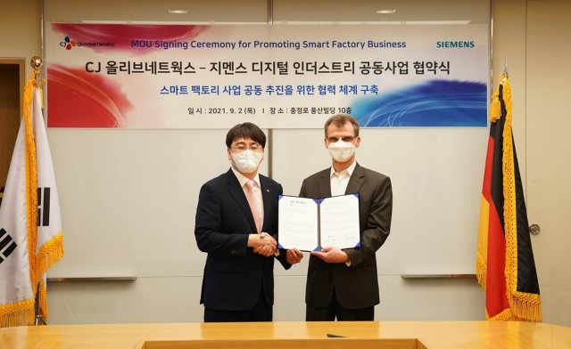 세계적인 전기전자 기업 지멘스의 한국법인 한국지멘스디지털 인더스트리(DI)와 CJ올리브네트웍스가 스마트팩토리 사업 공동 추진을 위한 업무협약(MOU)을 2일 서울 충정로 소재 한국지멘스 본사에서 체결했다.
