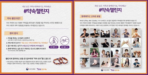 여성가족부도 이처럼 다양한 가족에 대한 포용적 인식을 확산하기 위해 11월 25일까지 ‘약속 잇기’ 챌린지를 사회관계망서비스(SNS)에서 실시한다. 다양한 가족의 모습을 있는 그대로 인정하고 존중하겠다는 약속을 하자는 일종의 국민참여형 캠페인이다.