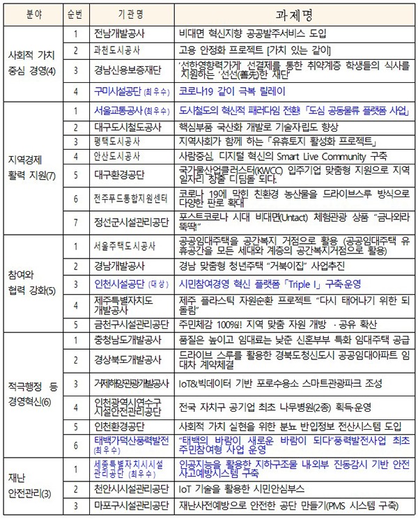 인천시설공단이 ‘시민참여경영 혁신 플랫폼’을 구축해 우수 지방공공기관 대상을 차지했으며, 구미시설공단과 서울교통공사, 태백가덕산풍력발전, 세종특별자치시 시설관리공단은 최우수상으로 뽑혔다.
