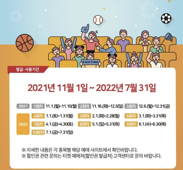 코로나19로 침체된 스포츠 시장 활성화 및 위축된 국민 스포츠 향유 기회를 확대하기 위해 전국민에게 문화체육관광부와 한국프로스포츠협회에서 프로스포츠 예매시 할인권을 지급하는 사업이다.