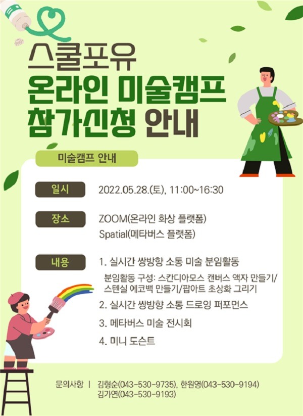 모든 활동에는 학생과 학부모가 함께 참여할 예정이다. 스쿨포유를 이용하는 초·중·고 학생, 가족 등 270여 명은 사전에 선택한 미술 체험 유형에 따라 온라인 분임을 구성해 참가자들과 교류하면서 미술작품 만들기 활동에 나선다.
